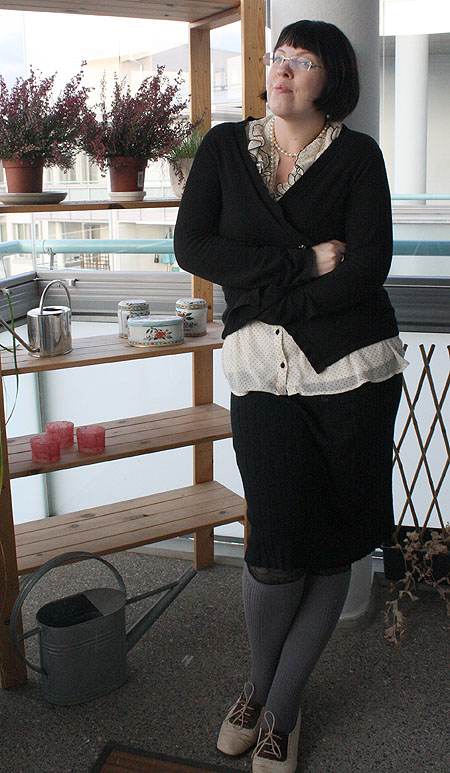 Taas alkaa olla käsillä se vuodenaika kun on kutakuinkin mahdotonta ottaa asukuvia kotona. Aamulla on hämärää kun lähtee ja illalla pimenevää kun tulee. Sepä sitten meinaakin kameran jokapäiväistä rahtausta töihin jossa voi kuvata valoisassa. Tänään vielä ehdin kiiruhtaa kotiin juuri ennen viimeisten valonsäteiden katoamista horisonttiin ja nytpä saattekin ihailla tämänpäiväistä vaatetusta.