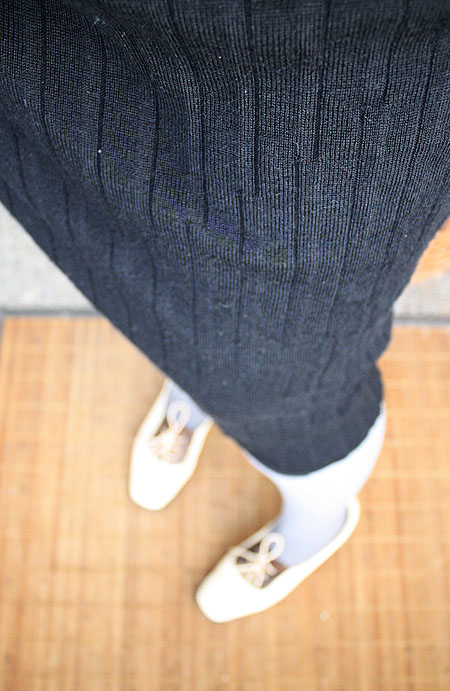 Modernimpaa vaikutetta olen sitten napannut ihan toisaalta. Salkan vanhan blogin postaus hameen tuunauksesta innoitti minutkin viimeistelemään vihdoin valmiiksi Arolan villaneule-hameen joka on ollut keskeneräisten pinossa viimetalvesta asti. Hame oli melkein nilkkapituinen, äärimmäisen epäpukeva joten päätin lyhentää sitä jonkun verran. Ja mitäpä siitä sitten tulikaan, no midi tietenkin. Näin jälkikäteen ajateltuna ehkä hitusen liian lyhyt makuuni mutta varmasti silti käyttökelpoinen. Neuleen pinnassa kulkevat hauskat pliseeraukset, jotka vaihtavat välillä suuntaa.