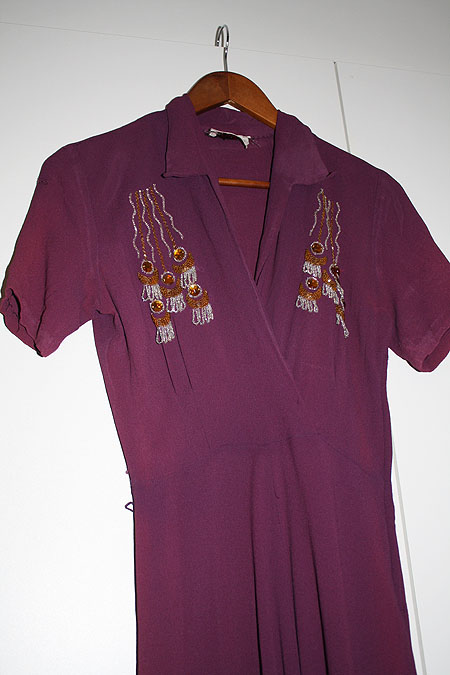 I have learned to trust my intuition when it comes to flea markets and thrift shops. Usually it means that when I get the feeling I have to go to particular flea market I go and I find something nice waiting for me. Today I ended up by accident in a local suburb and suddenly I got the feeling I have to go to local flea market. So I went there and guess what I found. Beautiful purple dress made of crepe with gorgeous beading on the bodice, onfy for a fiver. Very rarely I’m not happy about my size, but now I am a bit annoyed that I’m not size 34-36 (8-10 in UK size) because that is the size of that dress. I’m also sorry to say that dress has seen better days. There are lots of little holes here and there, largest on one shoulder. Crepe is tricky material because it gets holes so easily and they grow bigger easily aswell. Colour has also faded in places and sweat has done some damage in armpits. But it was so beautiful (and cheap) that I just had to get it. It is made by DuBarry and I would say it’s from 30’s, perhaps beginning of 40’s. Beading is pretty art deco and it was most popular in 20’s and 30’s. What do you think? Was it worth of five euros?