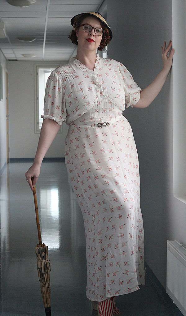 Ensimmäinen päivä tämän vuoden Suvi-vintagea on takana. Keli oli kuin morsio, tosin raidallisia kukkakärpäsiä tuntuu olevan tänä vuonna aivan riesaksi asti. Hellekelin kunniaksi puin päälle tämän erittäin herkullisen vintagelöydön jonka ostin muistaakseni parisen vuotta sitten kaverilta. Muistaakseni sitä ei ole blogissakaan ennen nähty. Puvun malli viittaa tuonne jonnekin 30- ja 40-lukujen taitteeseen. Puku on aivan hämmästyttävässä kunnossa ollakseen niinkin vanha. Se on ohutta, vilpoisaa viskoosia ja siinä on söpöiset röyhelöt hihoissa ja pääntiellä. Minä olen lisännyt metallisoljen ja kimaltavan napin jälkeenpäin koska vyö ei ylettynyt kunnolla solmuun. Helma on minulle ihan aavistuksen lyhyt, mutta menee näin kesähelteellä aivan hyvin.