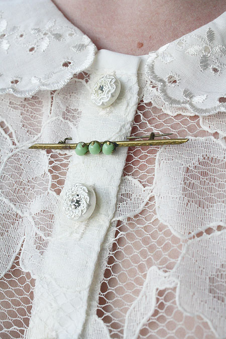 Desiree – Thank you so much, you make me blush again! Collar is actually readymade children’s collar I found from flea market. I have pile of them still waiting to be used. If you send me your post address I can send you one :D Glass buttons are all little bit different shapes and sizes, they are some sample buttons I thrifted long time ago. And yes, it is curtain again. I love to utilize what ever recycled material I can find and curtain lace is quite often rather pretty and also durable. However it is polyester and when weather is hot it makes me sweat like a piggy. Of course I don’t mind! Feel free to share :D