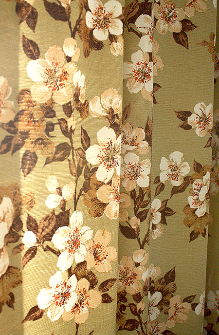 Kuulostaa, ja näyttää aivan juuri samanlaiselta kankaalta, kuin minun verhot! Tuo vihreän sävy, joka kuvista näkyy on kyllä aivan täysin mun makuun. Ja nuo kukkaset (ehkä omena?) on niin kauniit. Noista kuvista inspiroituneena rupesin suunnittelemaan omiani myös kesäksi makkarin ikkunaan. Ne on kaivettu pari vuotta sitten mökin kaapista, koska niissä olis ihan täydellinen ruskea ruusukuosi yhteen tiettyyn mekkomalliin, mutta tekemättä on jäänyt…