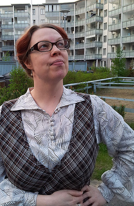 Over year ago I was asking your opinion about what kind of blouse I should make. I just could not decide. In the end I decided that with this print fabric it would be best to keep it simple. I ended up with this 20’s style number with sharp collar and fabric covered buttons. Unfortunately buttons disappear a bit to the print, but I just had to have them because they are rather cute.