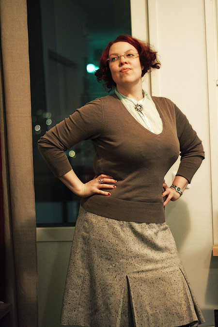 In my opinion the only bad thing about silk is the hard maintenance. Many silk fabrics can’t handle wash in water at all and stain removal can be pain in the… you know where. Machine wash is also often out of the question. Allthough, I have washed most of my silk garments in the machine, with gentle wool spin, without any problems. Today I switched the tante-silk top to this cutesy jersey top, which happens to be same colour. Previous knit was new addition to my silk collection, but this top I have had several years. It still looks like new, even though it is from H&M. Sometimes even the blind chicken finds the grain.