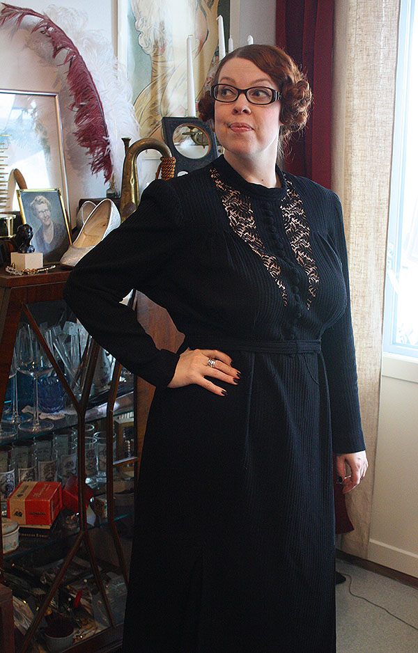 Asukuvien suhteen taas olen ollut täysin saamaton . Johtuen ehkä siitä että kuvattavaakaan ei kamalasti ole ollut. Koko tympeän kevättalven olen luuhannut gangsterihousuissa. Nyt oli kuitenkin pakko napata muutama kuva, kun puin päälle ensimmäistä kertaa uusimman mekkoni. Ostin tämän 30-40-lukujen taitteen puvun Hopeapeilin Elinalta. Kaapissani on jo aika monta mustaa vintagemekkoa mutta en voinut vastustaa kangaspäällysteisiä nappeja ja miehustan pitsidetaljeja. Luulin jo että sää oli muuttunut liian lämpimäksi villaiselle mekolle, mutta koska tuo takatalvi näköjään iski takaisin niin tämä pääsikin jo nyt käyttöön. Joten silvuuplee, päivän asu ja nasu. Ja otetaan bonuksena vielä Helsingin Burleskifestareiden asua.