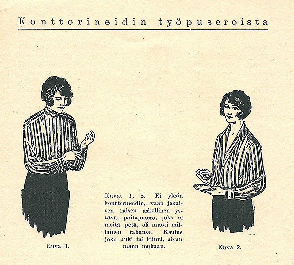 Ehkä tässä tapauksessa pukeutumisen tyyli onkin se, joka vähiten poikkeaa tästä ajasta. Tai ainakin voisin varsin hyvin itse kuvitella pukeutuvani konttorityöhöni kuvien 1 ja 2 mukaiseen puseroon ilman, että se aiheuttaisi hämmennystä ympäristössäni.