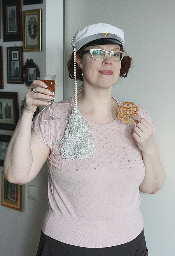 Not many people know that I too, have a tassel hat collecting dust in my wardrobe. Allthough it is a bit different than most. It is stylish silvergray instead of the more common black. (In Finland we have this old tradition amongst Polytechnic students. During Mayday celebrations they wear white hats with black tassels. Freshmen are allowed to wear tassel hat after dunking them into the cold river or sea. There is also similar white hats without tassels, those are worn by graduates from something you might call sixth form college or upper secondary school) In commercial school this tradition is not that strong, however we do have either silvergray or green tassel hats, rarely seen though. That’s why I wanted to wish you very happy Mayday, wearing my tassel hat and consuming large quantities of mead and rosettes (traditional Mayday snacks, get recipe here).